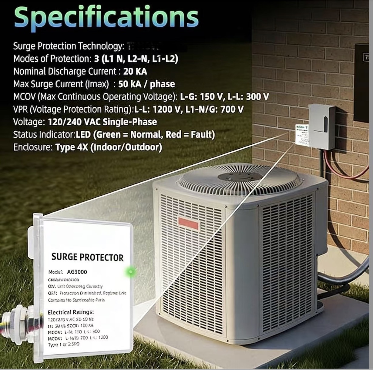 • 120/240 VAC Single Split Phase SPD for use on a variety of HVAC Equipment